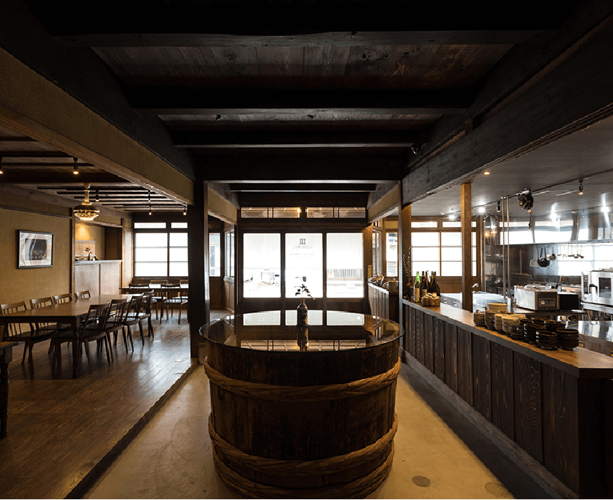 旧石橋酒造で醸造に使われた大樽の円卓は、