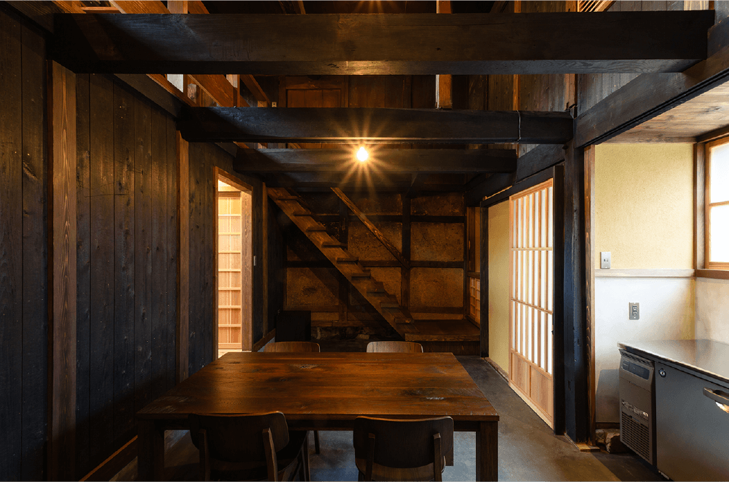 吹き抜けの1階はテーブルを置いた土間のキッチン。